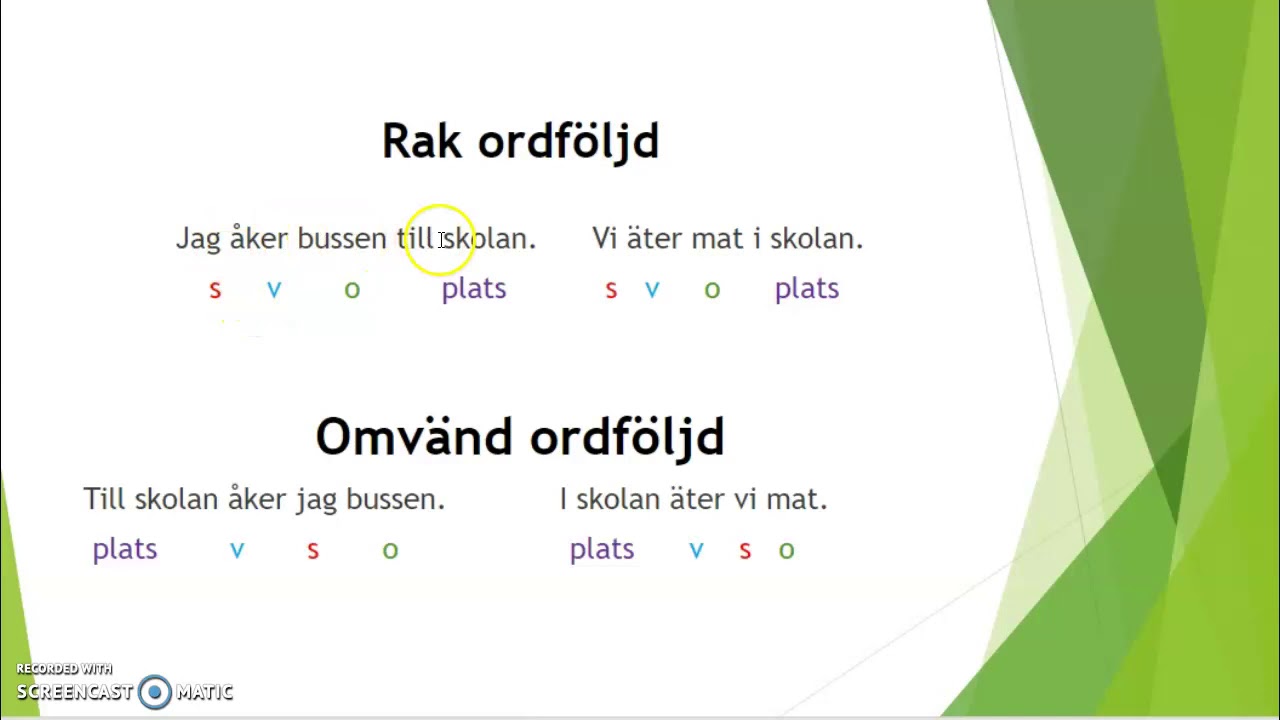 I svenskan kan du skriva meningar med rak eller omvänd ordföljd. Rak ordföljd börjar ofta med subjekt. Då kommer tid eller plats sist i meningen. Omvänd ordföljd börjar ofta med tid eller plats. Då kommer subjektet på tredje plats i meningen. Exempel: Rak ordföljd Omvänd ordföljd Jag åkte hem till min kompis på kvällen. ← börjar med subjekt På kvällen åkte jag hem till min kompis. ← börjar med tid Det finns en staty som heter Poseidon i Göteborg. ← börjar med (formellt) subjekt I Göteborg finns det en staty som heter Poseidon. ← börjar med plats Jag tycker att svarta oliver smakar gott. ← börjar med subjekt Svarta oliver tycker jag smakar gott. ← börjar med objekt Träna med film (referenskälla) / luyện tập với video tại đây ( Nguồn tham khảo) Lycka till ☺ och kom ihåg att du kan skriva till oss på hemsidan eller mejla till svafv2022@gmail.com Chúc bạn may mắn, hãy…