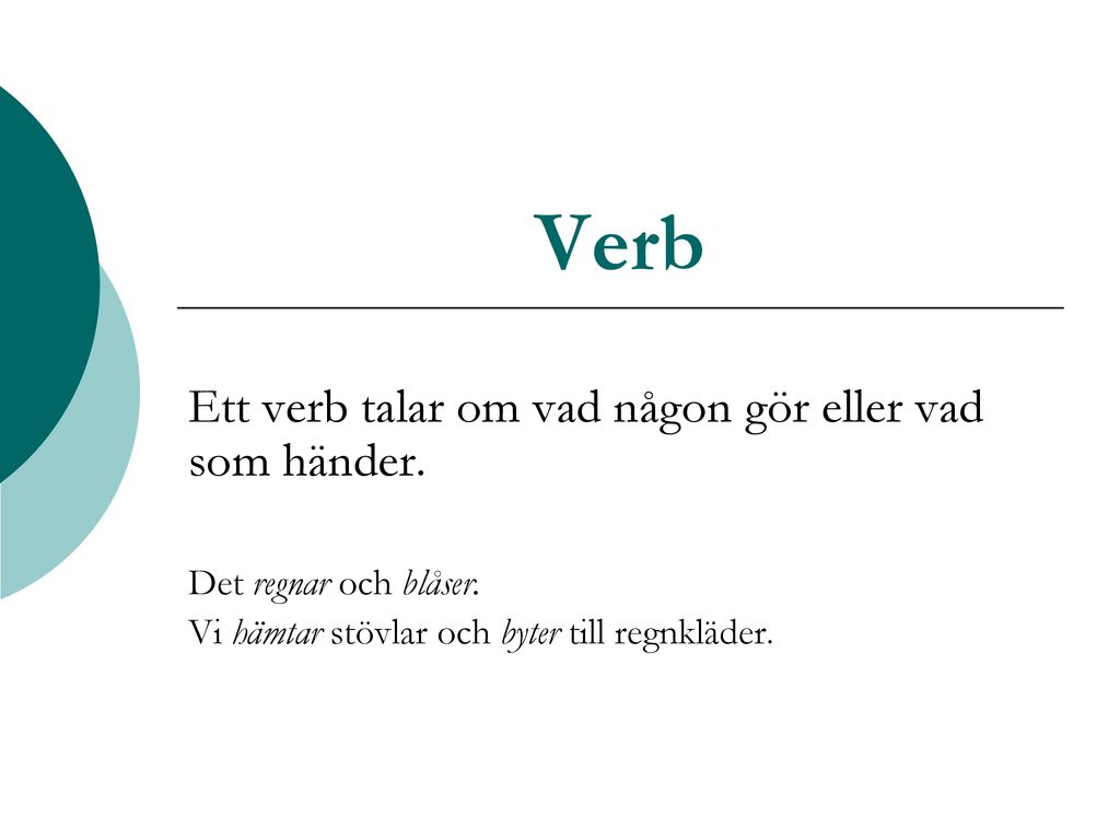 Verb beskriver något någon gör eller något som händer. Verb har en grundform – infinitiv. Verb har sex tempusformer och två tidsperspektiv. Verb kan vara hjälpverb och huvudverb. Verb har en uppmaningsform – imperativ. Verb beskriver något någon gör eller något som händer. Exempel: läser tänka prata gå vill kör spelar äter spring 1. Verb har en grundform – infinitiv. Infinitiv är verbets…