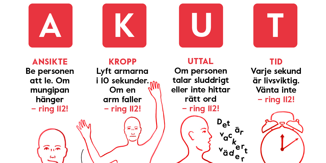 1. Vad är AKUT? A (Ansikte): kan person le och visa tänderna? Ring 112 om personen inte klarar det eller om mungipan hänger. K (Kroppsdel): Kan personen lyfta båda händerna över huvudet i tio sekunder? Ring 112 om personen inte klarar det eller om en arm faller ner. U (Uttal) : Kan personen säga en…
