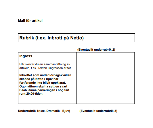 – En nyhetsartikel ska innehålla rubrik, ingress, brödtext och mellanrubriker. Ex: bildtext om det finns en bild.