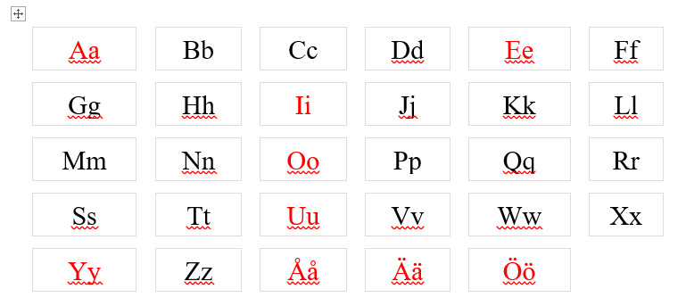 - Alfabetet har nio vokaler “ A O U Å E I Y Ä Ö”. De röda bokstäverna är vokaler.