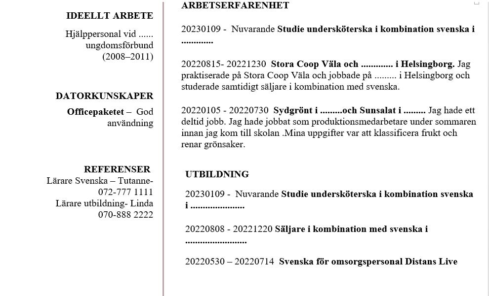 Mitt namn är …………………., …. är mitt efternamn. De flesta kallar mig…………… Jag är intresserad av din anställning som vikarier. Jag kommer från Vietnam och har bott i Sverige i ett år och sex månader. Just nu studerar jag svenska på yrkesutbildning undersköterska kombination med svenska på lärcentrum i ………………… och söker ett jobb i äldreboendet eller hemtjänst. Trots att är jag nybörjar men jag alltid försöker studera och jobba samtidigt för att jag kan vara en del i samhället i Sverige. I framtiden hoppas jag att bli bra undersköterska för att hjälpa många andra.