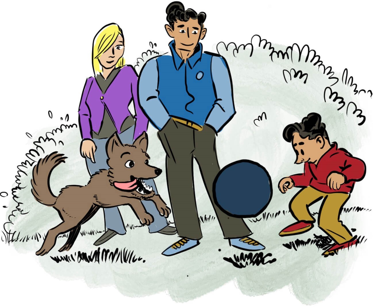 Då går hela familjen ut och promenerar och spelar fotboll.