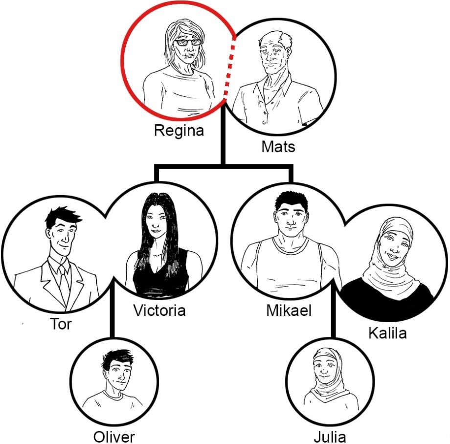 Jag heter Regina och är gift med Mats. Vi har två barn, en dotter och en son. Vår dotter heter Victoria och vår son heter Mikael. Victoria är gift med Tor. De har en son som heter Oliver. Mikael är gift med Kalila. De har en dotter tillsammans, hon heter Julia. Oliver och Julia är mina och Mats barnbarn.