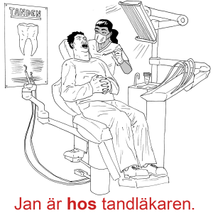 | Exempel: – Jag är hos Erik. – Pojken är hemma hos en kompis. – Barnen är hos grannen. – Cykeln är hos Patrik. – Jag är hos tandläkaren. – Eva testar nya glasögon. Hon är hos optikern. |