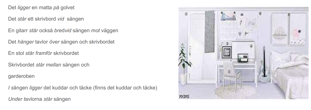 — | Jag bor i ett hus. Äpplet ligger i väskan. Soffan står i vardagsrummet. |