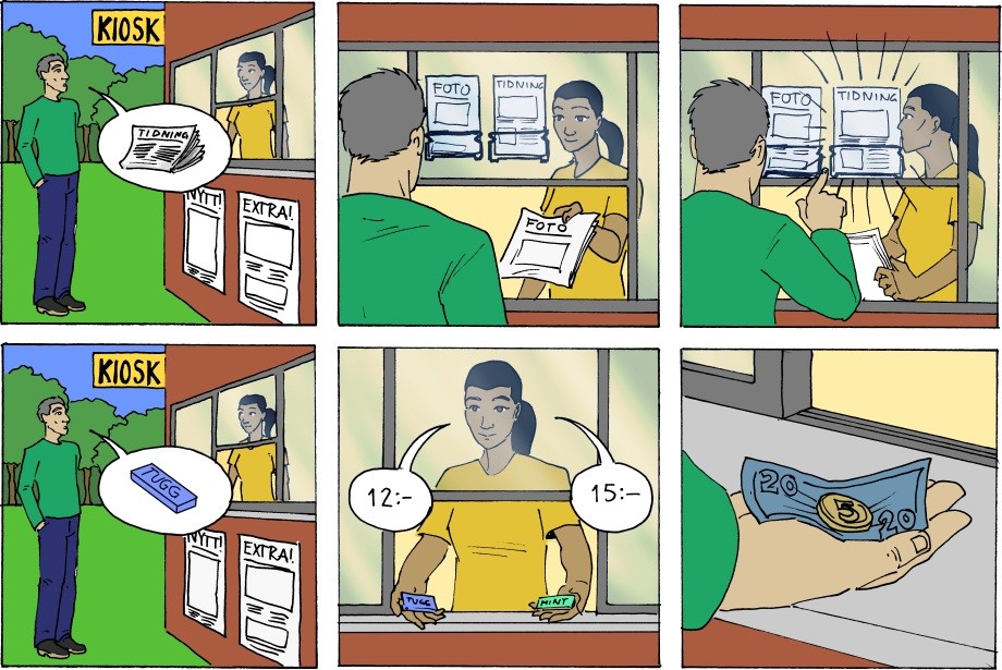 • Okej, det här kostar 12 kronor och det här kostar 15 kronor.