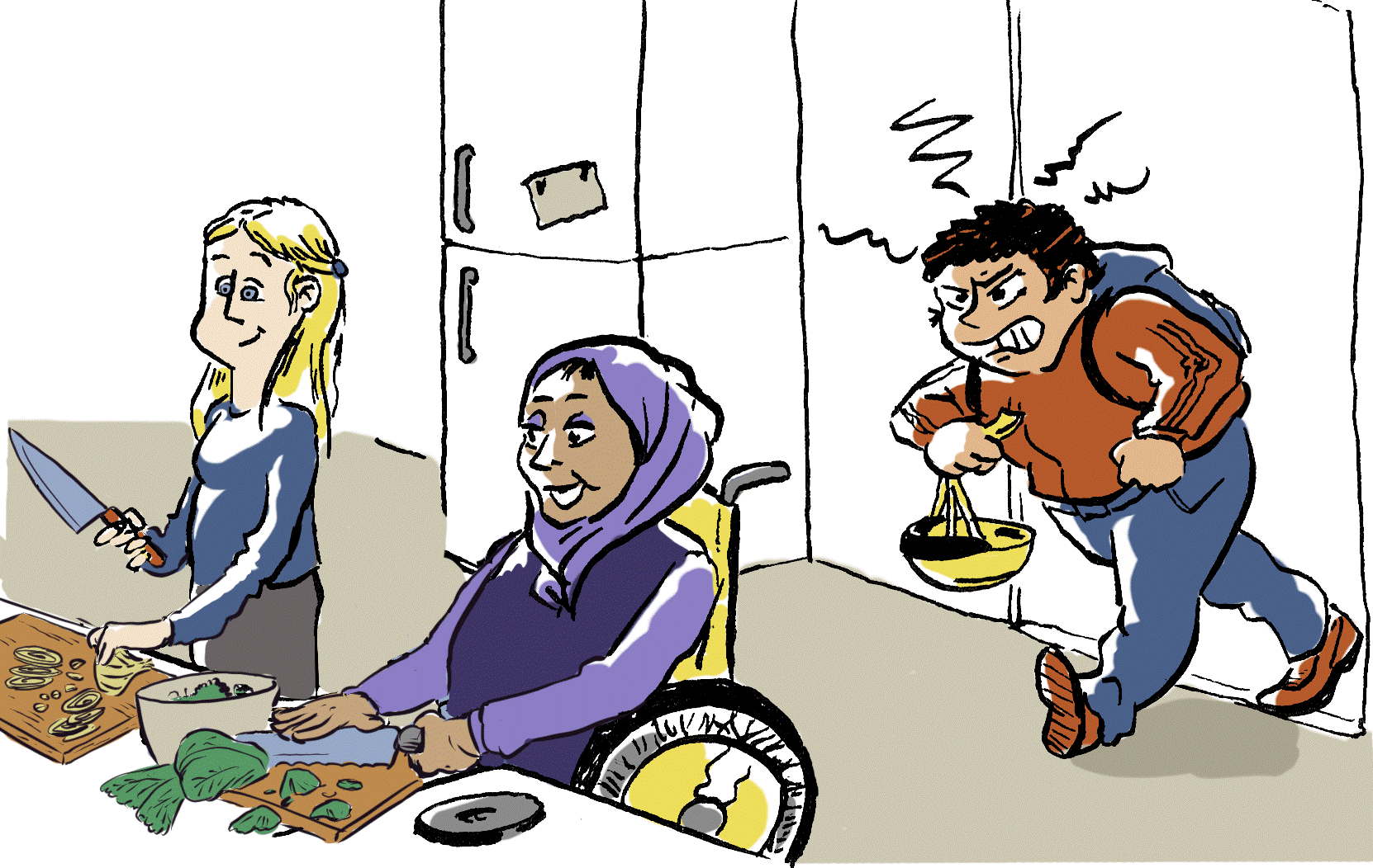 Nu är Alina och Rokia i köket och hackar lök och skär sallad när de plötsligt hör sin kamrat Mia komma in genom dörren. Båda tittar förvånat på henne när hon kommer in i köket.