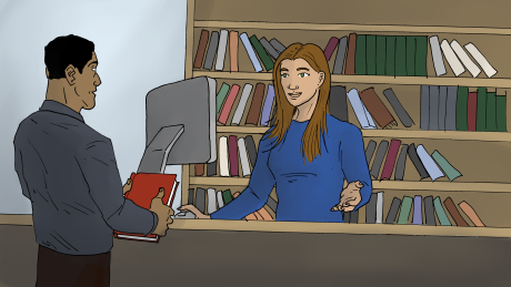 Omar är på biblioteket. Han vill låna en bok. Han behöver ett lånekort. Katarina arbetar på biblioteket. Hon är bibliotekarie.