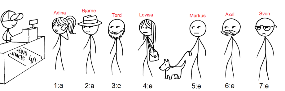 Adina är första personen i kön. Bjarne är andra personen i kön. Tord står på tredje plats. Lovisa står på fjärde plats. Markus står på femte plats.Axel är sjätte personen i kön.