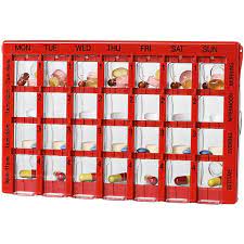 Hjälpmedel i form av en liten ask med fack för olika dagar och tider för att dela upp ordinerade läkemedelsdoser.