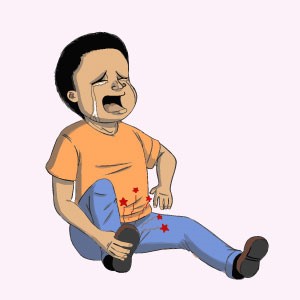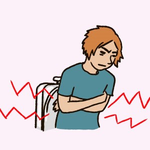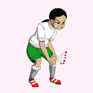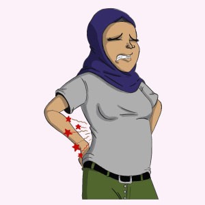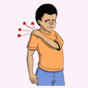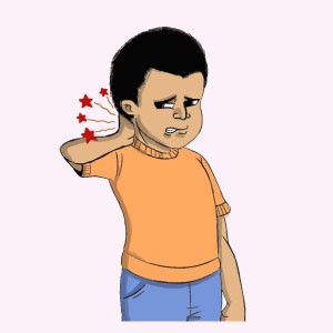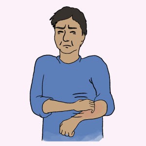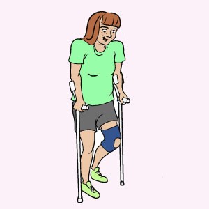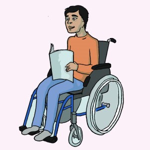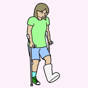 Han sitter i rullstol./Han är rullstolsburen. Hon hoppar på kryckor.