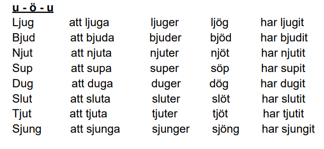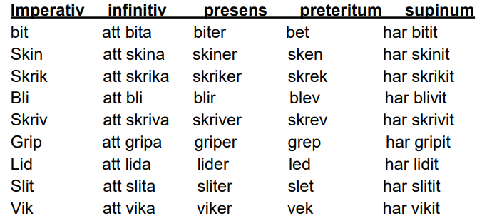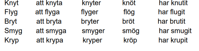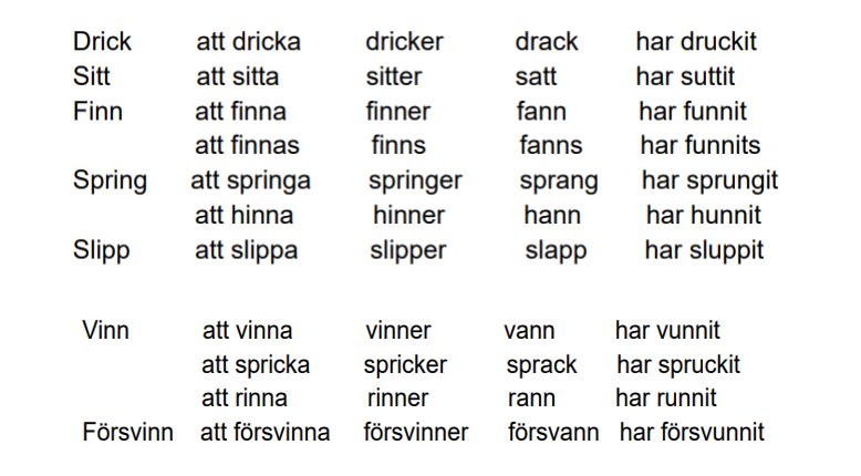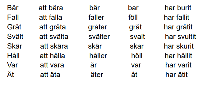 Verben i grupp fyra byter vokal i preteritum och ibland i supinum.Här kommer några vanliga exempel.